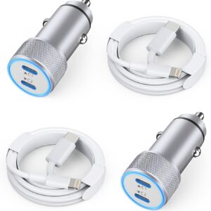 iPhone Car Charger,【2Pack】Dual Port USB C Fast Charger Car Power Adapter [Apple MFi Certfied] Apple Charging Cigarette Lighter with 2Pack Lightning Cable for iPhone 14 13 12 Pro 11 X SE 8 iPad- Silver