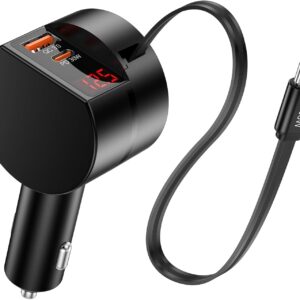 Mini Retractable Car Charger,65W Fast Charging USB C Car Charger with Retractable Cable,3 Port Type C Cigarette Lighter Adapter,Car Accessories for iPhone 16 15 14 Pro Max,Galaxy,iPad,Pixel,AirPods