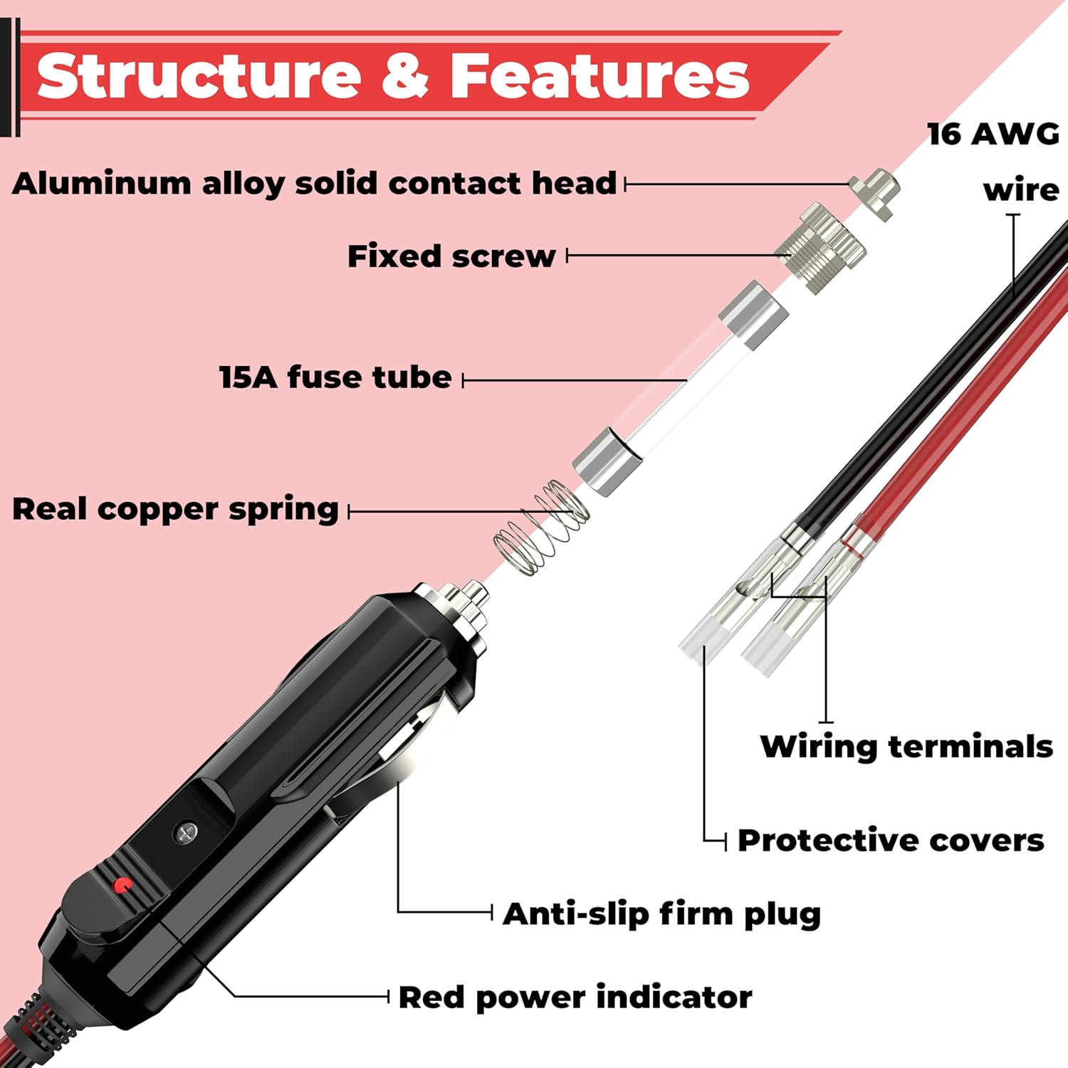 High Quality: The cigarette lighter plug shell is resistant to high temperature and corrosion, and 16 AWG pure copper wire, which greatly improves the conductivity