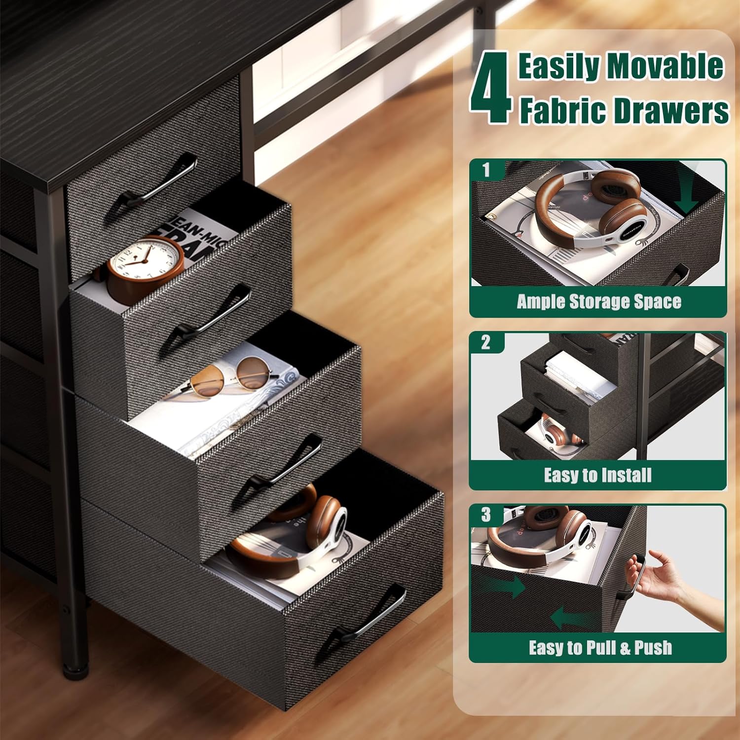 4 Upgraded Fabric Drawers: Drawers made of high-quality non-woven fabric that is lightweight and breathable.The 4 drawers can be switched around and provides plenty of storage space.