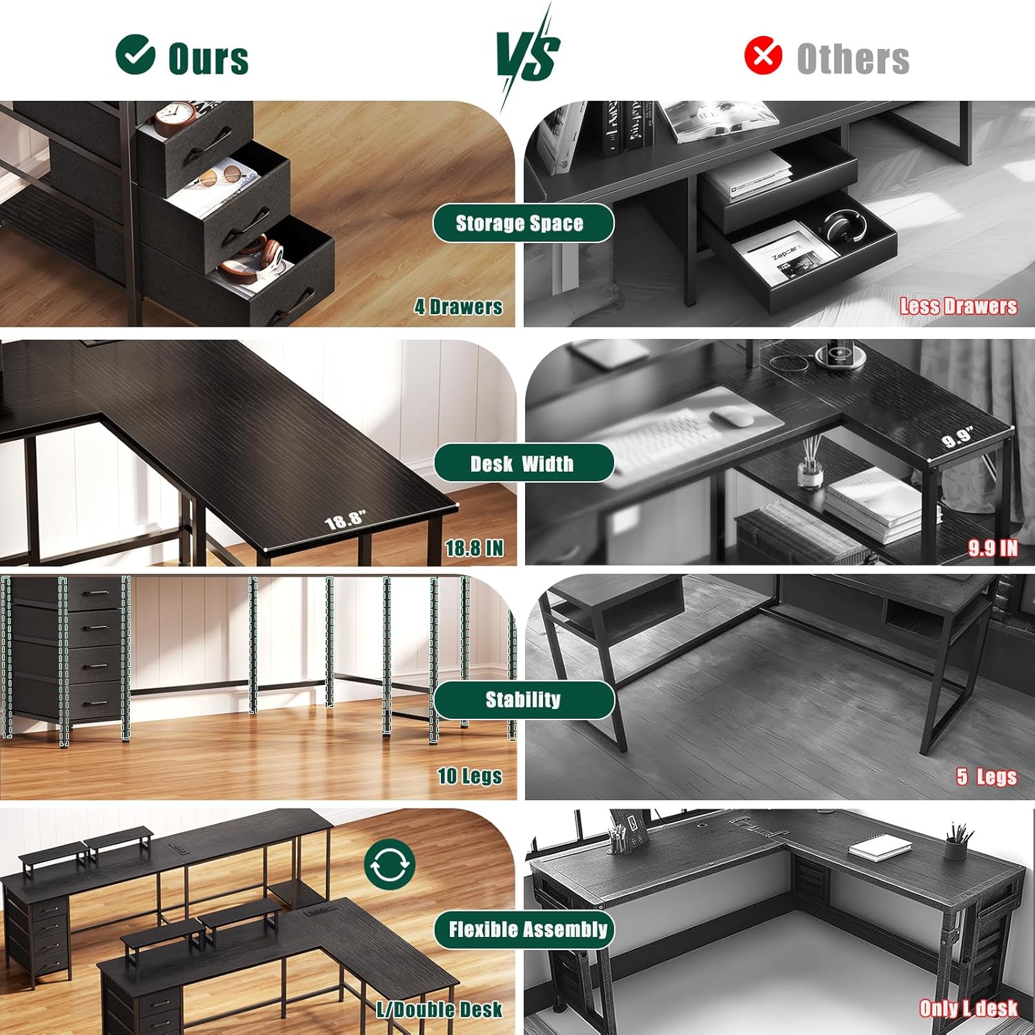 2 in 1 Computer Desk: The study desk can be installed in an L-shape or long, depending on your requirements. Drawer placement can be switched as well. This home office desk can be used as a wark desk, study table or game table.