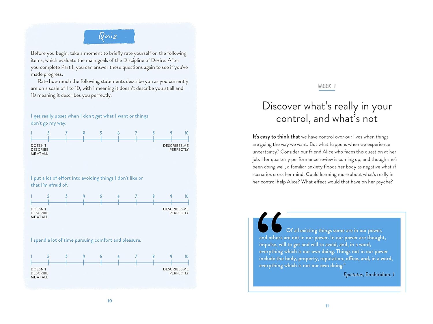 This exercise will help you explore the dichotomy of control. Sit down at this time Monday through Saturday of this week and choose something that happened that day to write about. It can be anything from seeing a friend for lunch to a meeting at work. We suggest that you choose an event that wasn’t too emotionally upsetting, which could make the exercise more difficult. List what aspects of the event were completely in your control and which weren’t. It may help to add some quick reasons why the thing was or wasn’t in your complete control.