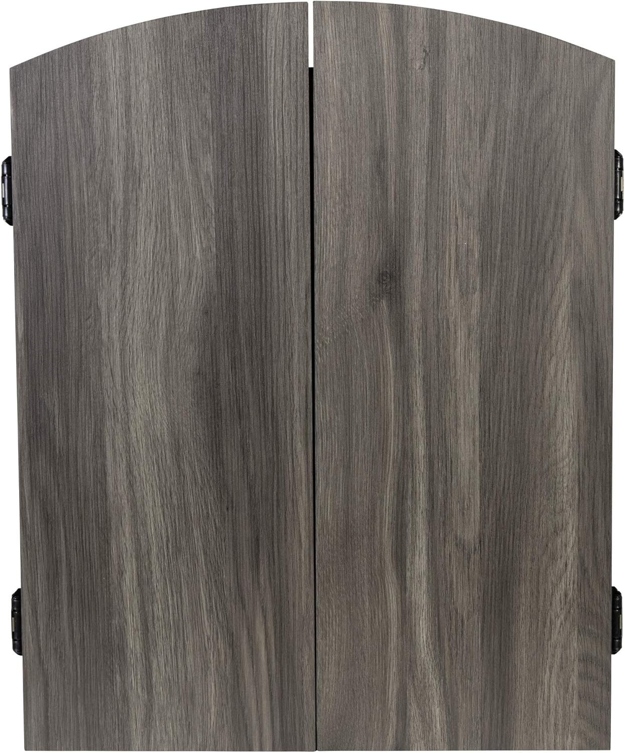 INTEGRATED GREY WOOD CABINET WITH DART STORAGE – Stylish wall-mounted cabinet includes built-in holders for up to 12 darts, keeping everything organized and protected between games.