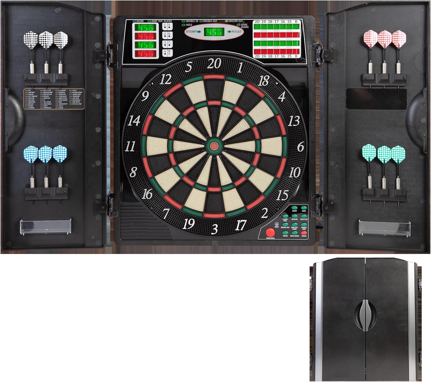 CONTEMPORARY STYLE – This durable electronic dartboard is mounted in a contemporary-style cabinet.