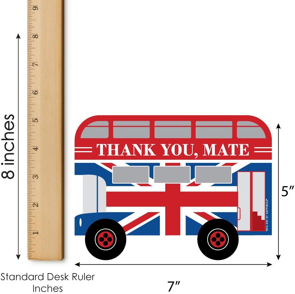 Thank your guests for celebrating by sending Cheerio, London thank you cards. Each bus shaped thank you note cards are printed double-sided on sturdy cardstock paper. These fun thank you cards feature our Cheerio, London theme and have plenty of space to write a special note of thanks. Each set of 12 shaped thank you note cards includes 12 white envelopes, making it easy to send a special thank you by mail.