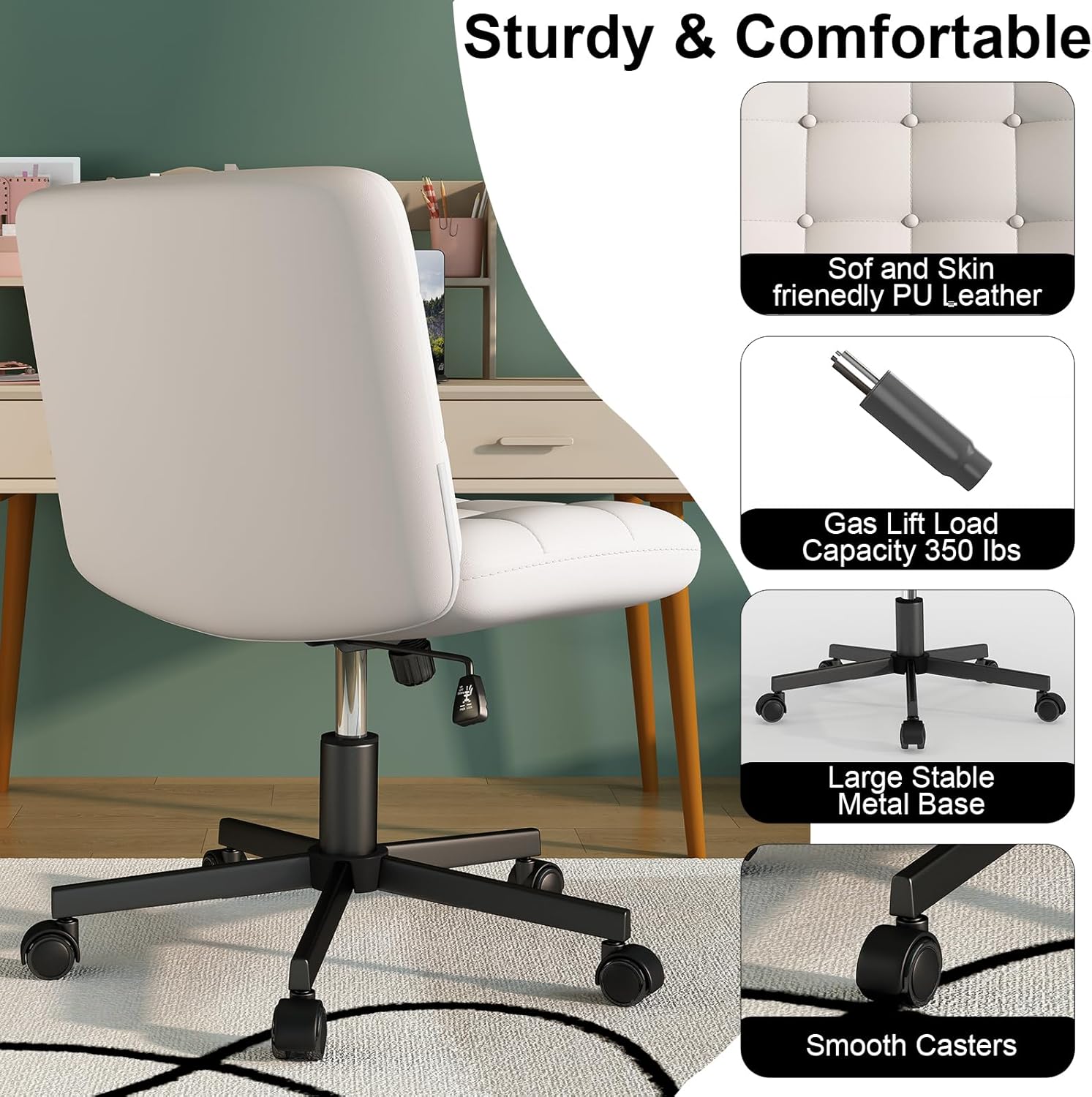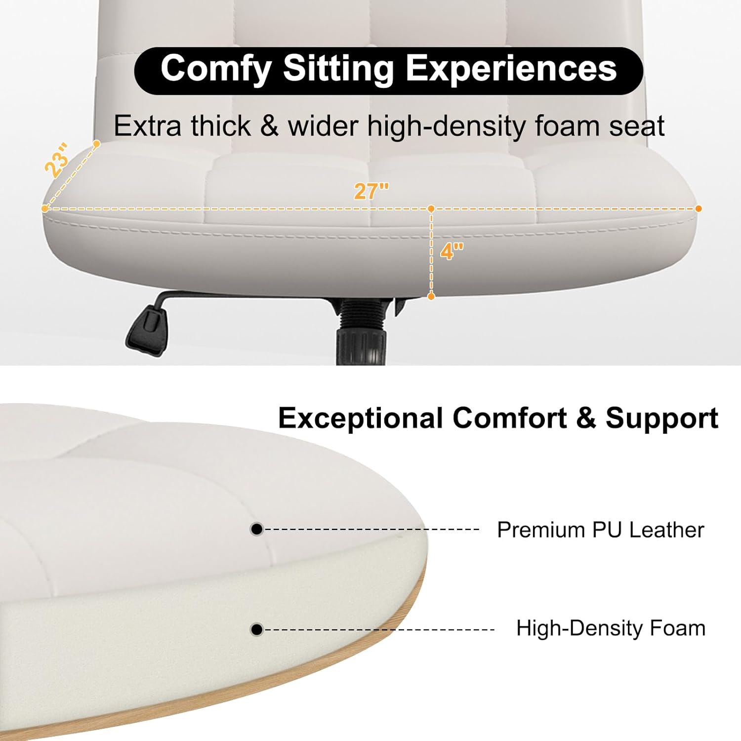 Soft Cushions: The white armless office chair cushion and backrest are padded with high-density sponge and wrapped in durable PU leather, ensuring long-lasting comfort and resistance to deformation