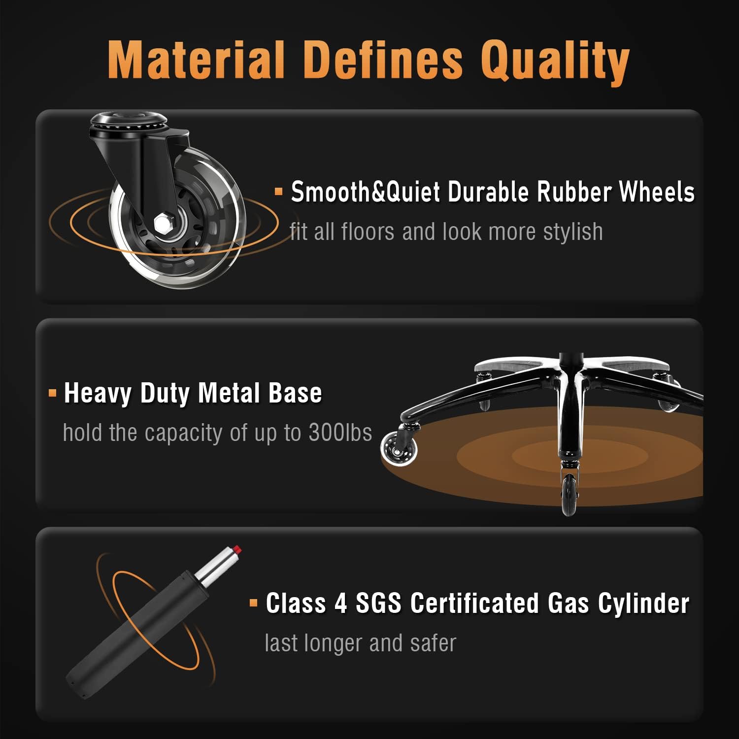 【Durable Chair For Most People】With a durable metal base, a heavy-duty gas cylinder, and smooth-rolling racing-style wheels, our work chair is made to last. It is extra-sturdy and stable and makes a long-lasting office accessory. The 300-pound weight capacity accommodates people with big or large body types, and the wide seat makes getting in and out easy