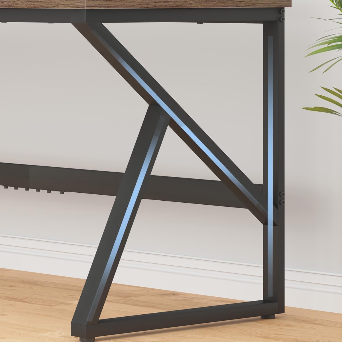【Spacious Work Space & Leg Room】: Measuring 31.5″D x 70.8″W x 29.5″H overall, this large home office desk offers ample space to accommodate multiple monitors, pc, laptop, printers, files, books, lamps and any other office essentials, ensuring you have everything you need within arm’s reach for enhanced productivity. The desktop is crafted from three meticulously joined panels, creating a cool cross-grain effect. Featuring two K-shaped metal legs with an open structure, this extra long computer desk provides ample leg room, promoting comfort during extended periods of use.