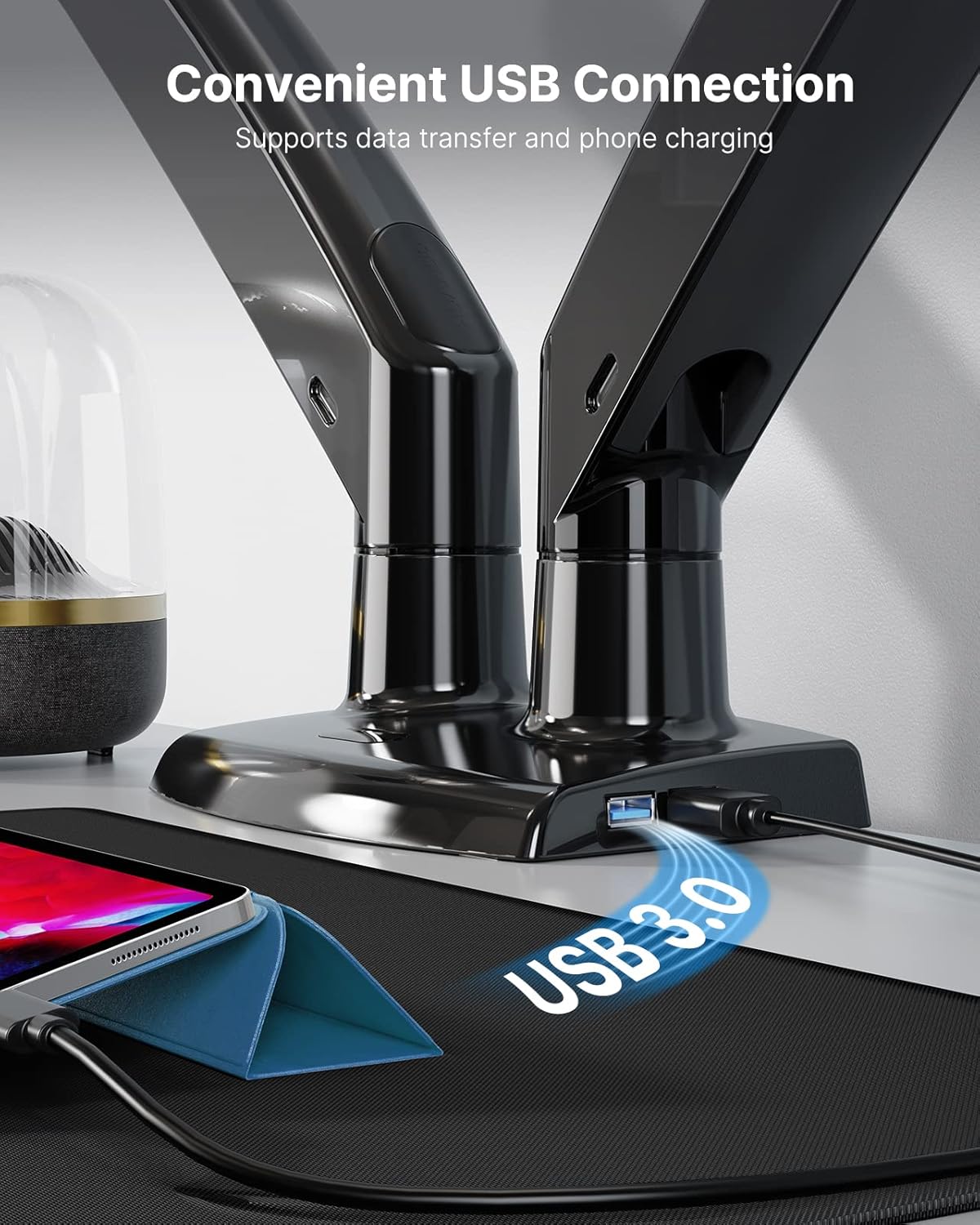 Increased Stability & Convenience – The enlarged base and sturdy construction ensure huanuo dual monitor stand superb stable. Supports both clamp and bolt-through grommet mounting for desk thicknesses up to 3.54″. The hole for grommet mounting should be 0.39″ to 1.97″ in diameter; the built-in USB port provides an easy way to charge your USB devices.