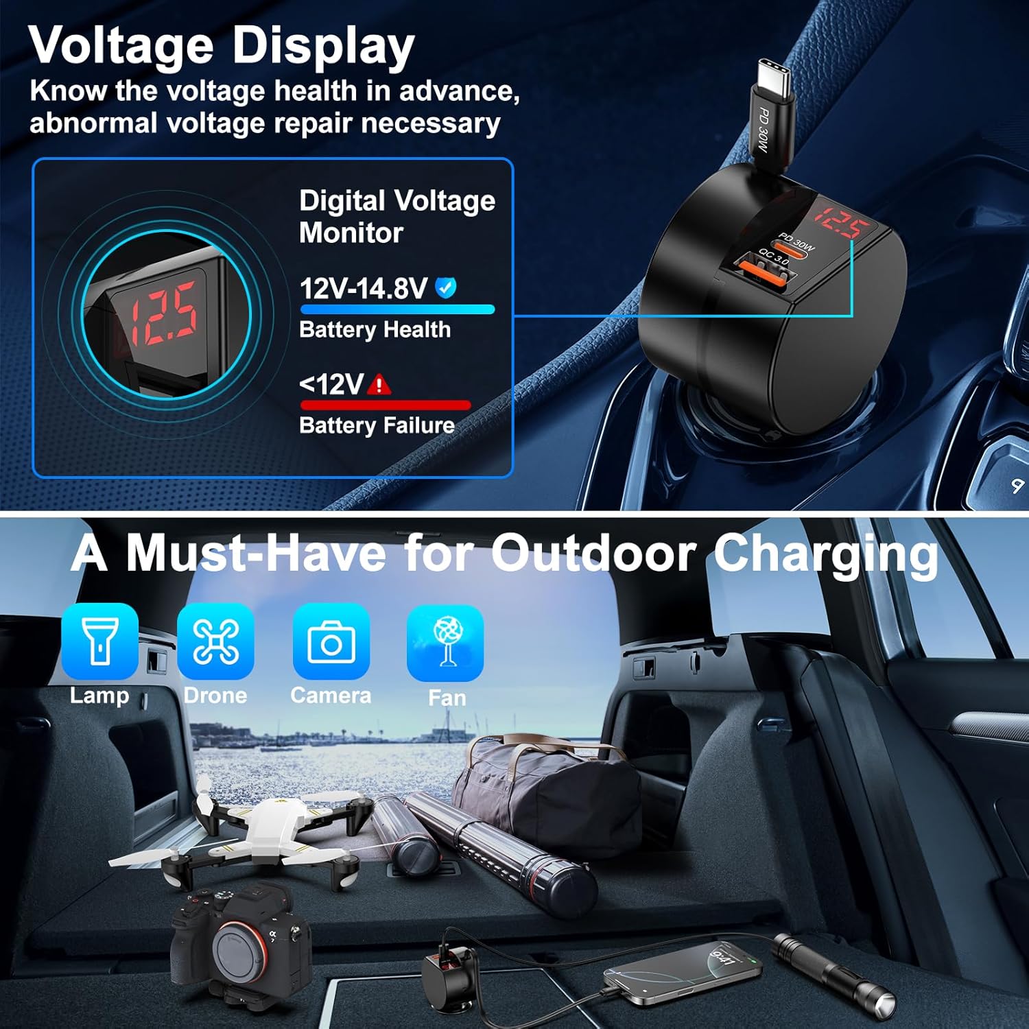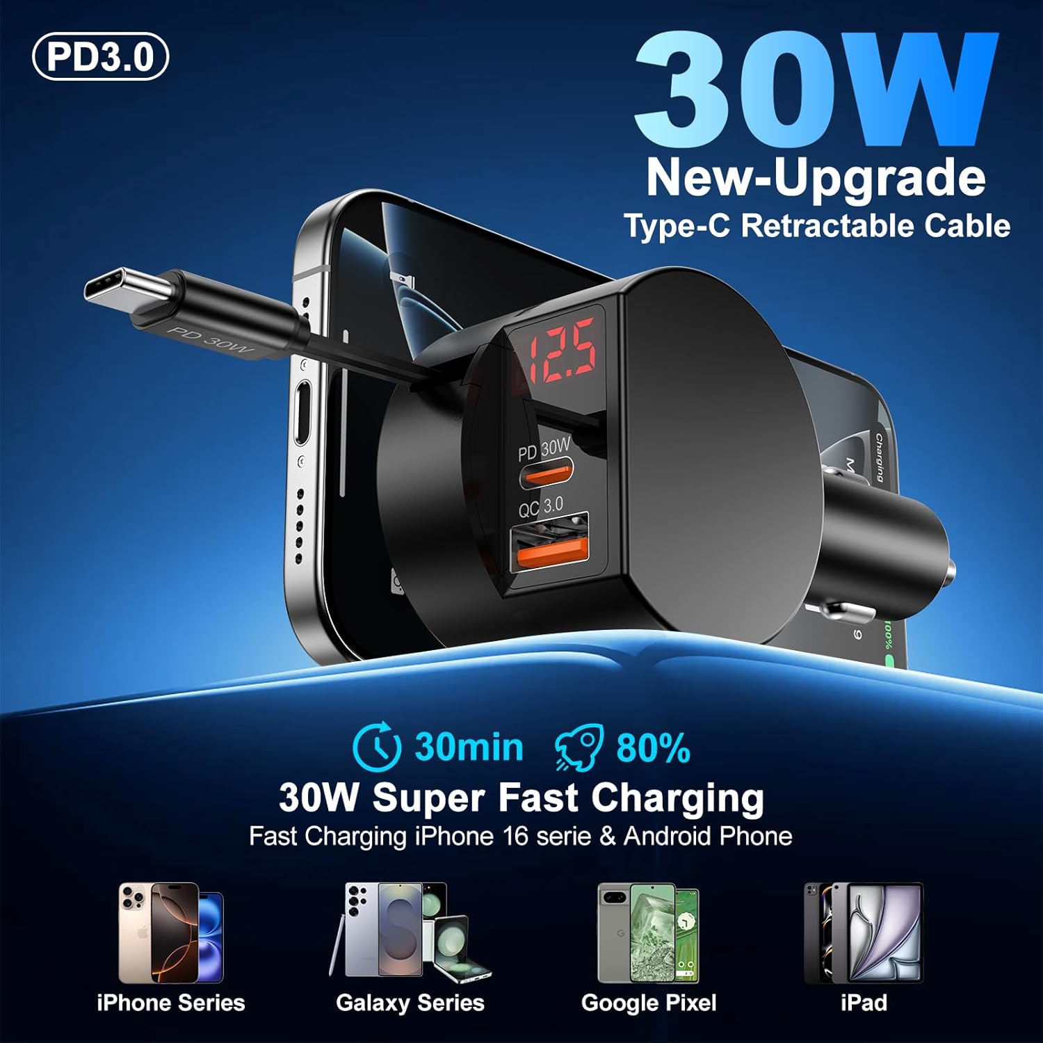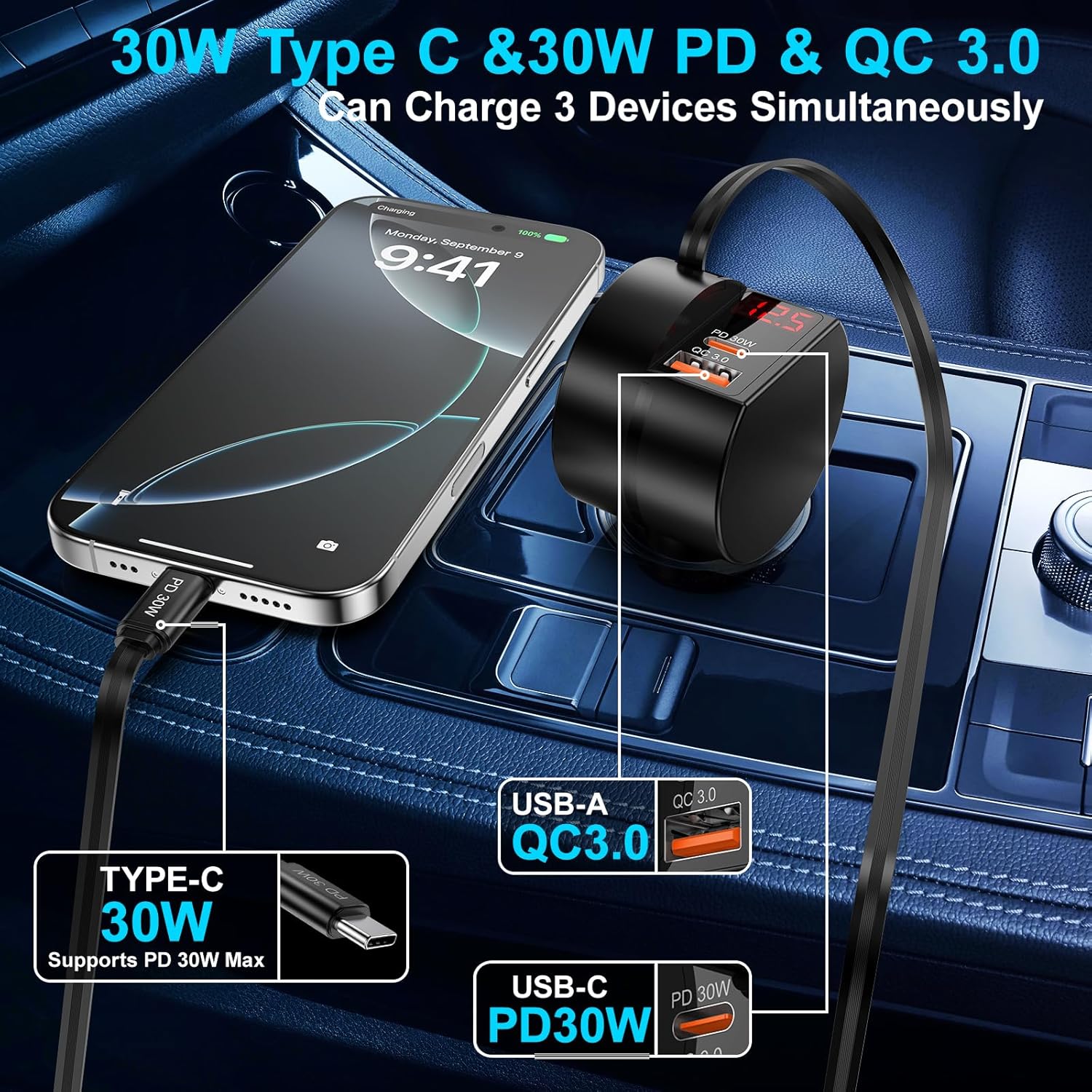 【Upgraded 3-in-1 Fast Charging Retractable Car Charger】 This retractable usb c car charger comes with a retractable cord and 2 charging ports( USB A+ USB C),enable you to charge up to 3 devices simultaneously.The PD 30W Type-C retractable cable is ideal for fast charging iPhone 16/15 series/Samsung S25/S24/S23 series.The additional PD 30W USB-C port and QC3.0 18W USB-A port can fast charge all prevailing phones and E-devices.No need for multiple chargers, just one car charger for all your charging needs.