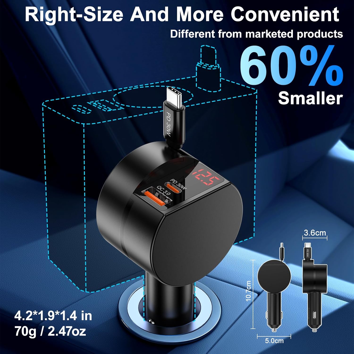 【Mini Size and Less Space Car Charger】Compared with other bulky retractable car charger, this sleek retractable car phone charger features a smaller size for better user experience.The USB C car charger measures 4.21 x 1.97 x 1.42 inches and the weight is approximately 70g,eliminating the risk of bulky chargers interfering with driving. It fits perfectly in tight cigarette lighter sockets, improving convenience. A must-have for long trips, it’s especially suitable for trucks, older cars, and other tight spaces.