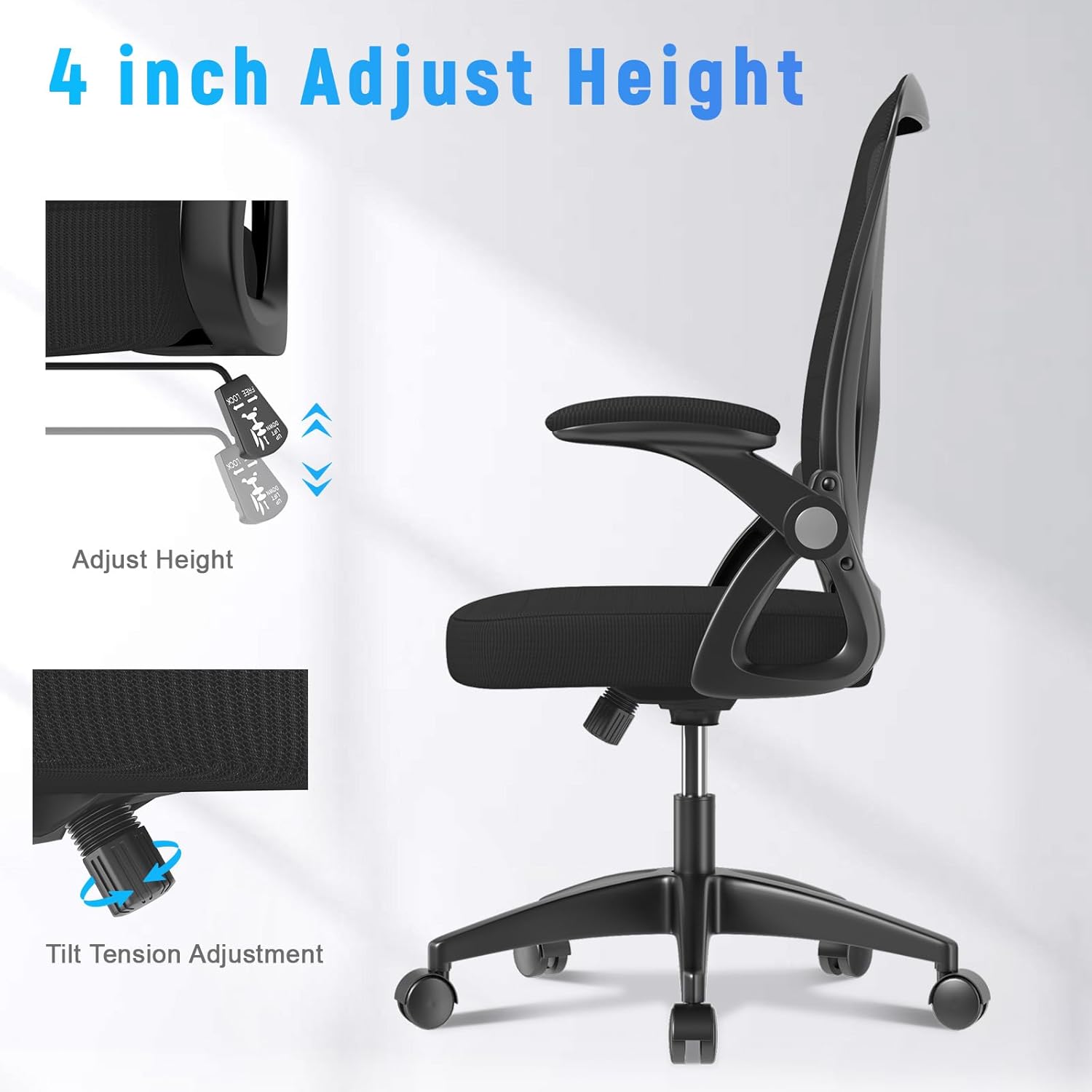 【Multi-Adjustable Functions】Naspaluro desk chair’s flip-up armrests provide comfortable support for your arms and can be folded upward when not in use to save space. Our home office chair allows flexible adjustments in height and tilt angle. The best position adjustment can be achieved through the adjustment lever under the seat.