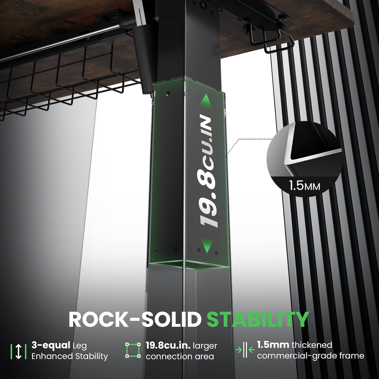 【Solid and Durable】The L-shaped electric standing desk features a durable and wear-resistant tabletop paired with three equal-length legs . During a 250LBs load-bearing test, the motor can smoothly perform 50,000 lifting and lowering cycles. SIAGO L-shaped standing desk — Redefining the lifecycle of office furniture through industrial-grade durability
