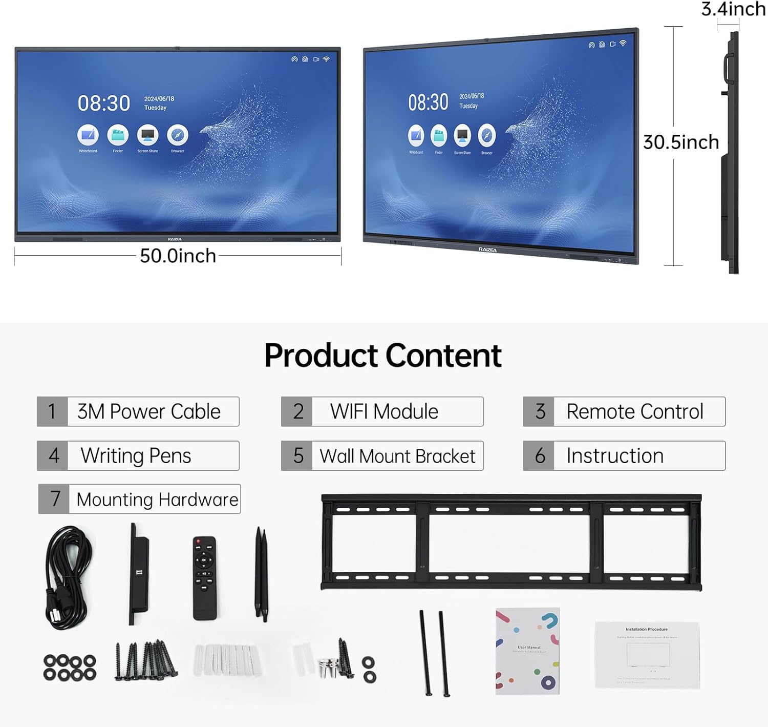 【Package Included】1*RAIZEA presentation electronic white board, 1*WiFi module, 1*Wall mount bracket, 1*User manual, 1*Power cable, 1*Remote control, 2*Writing pens, Other mounting hardware.