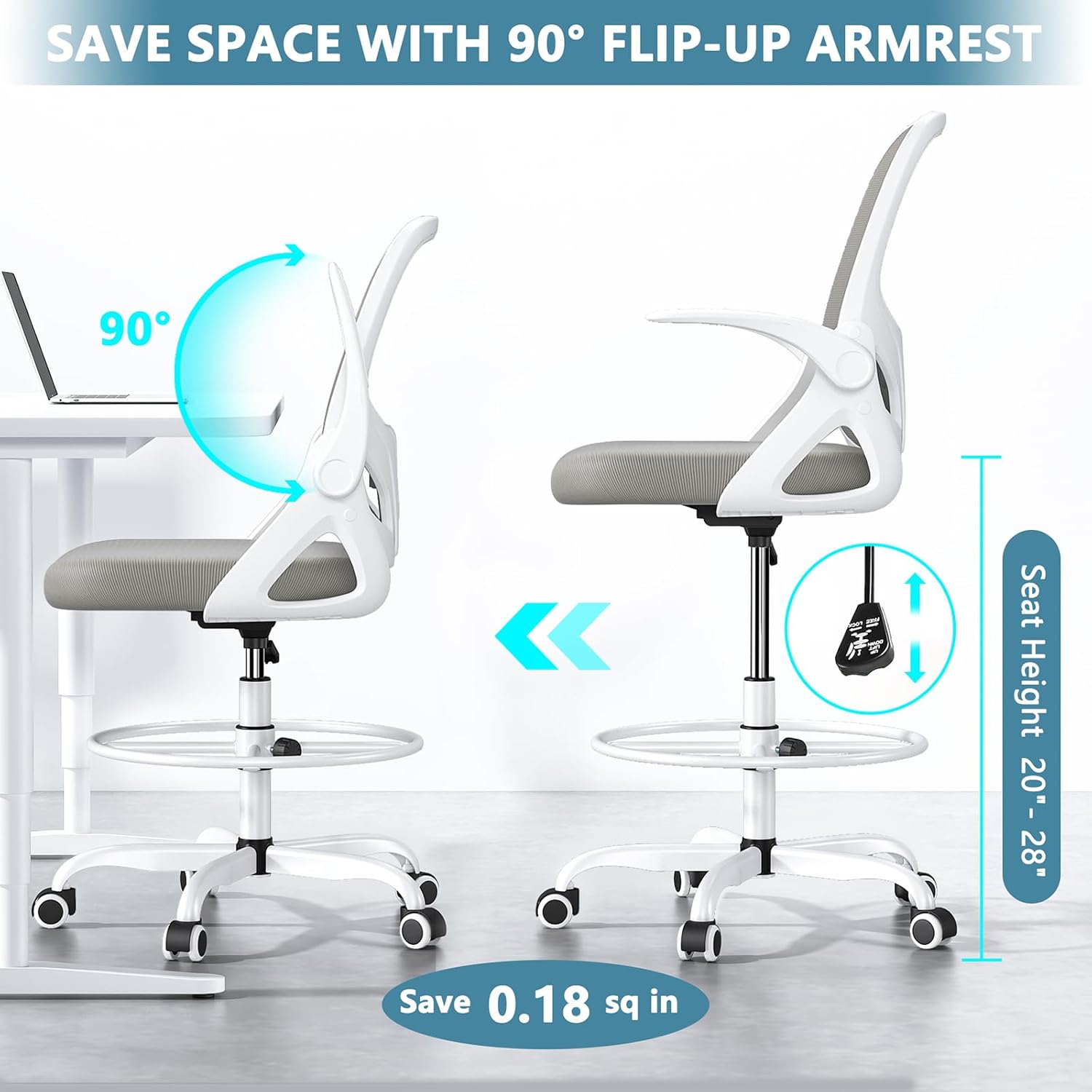 Multi Function Application: Kensaker features 90°flip-up armrest, supportive tilt lock function, 360°rotation and solid casters for smooth movement. This tall office drafting chair has a round foot ring, which can help you move your feet more frequently