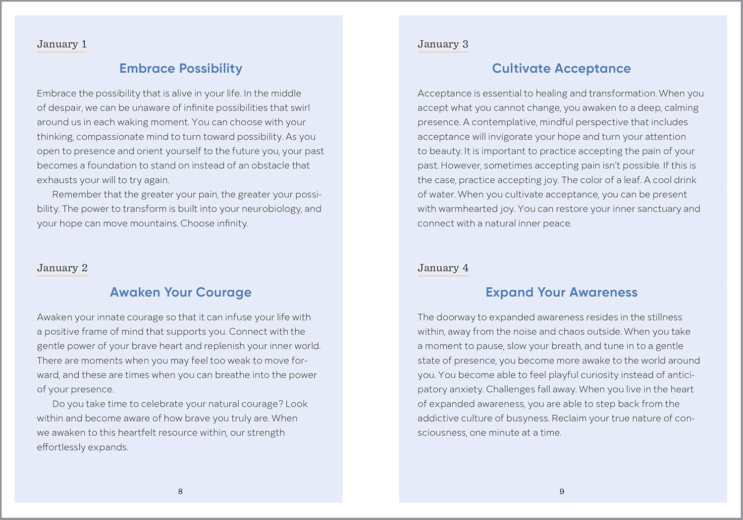 Discover the benefits of spending a few minutes a day in mindful meditation as you embrace possibility, awaken to curiosity, and take inspired action. Expand your potential as you devote yourself to the practice of compassionate tenderness in a way that only daily meditation books allow.