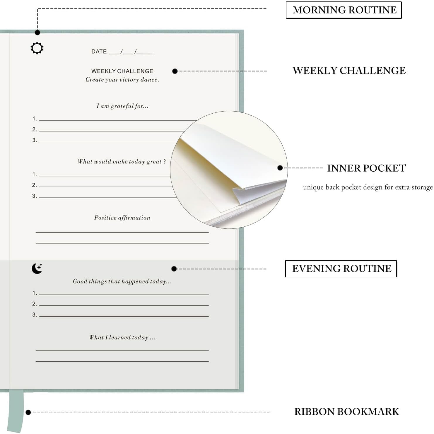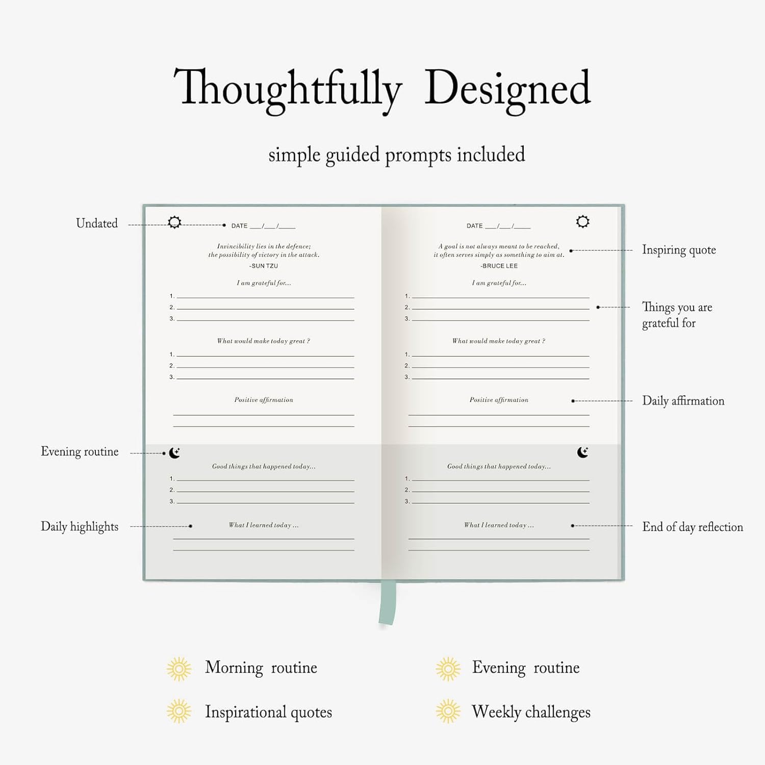 Enjoy six months of undated daily journaling with this undated gratitude journal. Its scientifically structured format includes inspiring quotes, morning gratitude, goals for the day, daily affirmations, acts of kindness, and evening self-reflection. With a high-quality binding, you can cherish every page without worry.