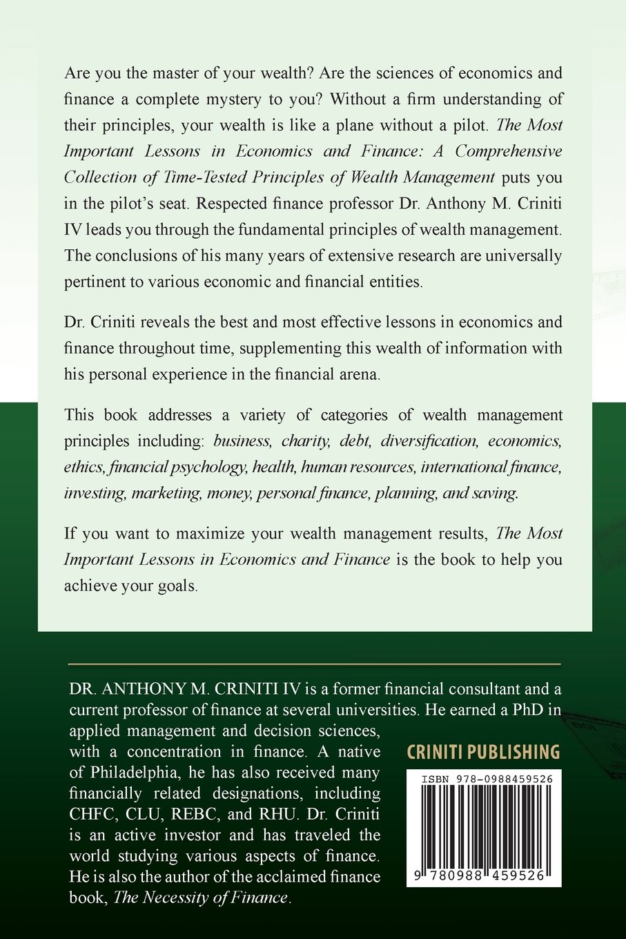 The Most Important Lessons in Economics and Finance: A Comprehensive Collection of Time-Tested Principles of Wealth Management represents the fruits of an audacious undertaking: the pursuit of the most effective economic and financial principles from the dawn of record keeping to the present day. Using everyday terms and readily grasped concepts, Dr. Anthony M. Criniti IV, a former financial consultant and current university-level finance professor, sets out to expand off the new paradigm of the economic and financial concepts introduced in his previous book, The Necessity of Finance; explore the most important lessons in economics and finance; provide a platform for economic and financial entities to be able to better manage their wealth; and create a foundation for future research studies on these subjects. Dr. Criniti breaks down complex terminology and scholastic discoveries in economics and finance into layman’s terms, allowing readers of all levels of economic and financial acumen to put his powerful wealth management principles into practice. Starting with an introductory overview, moving forward to present the basic terminology necessary to understand the structure of this work, presenting in the process an elaboration on its scientific aspects, The Most Important Lessons in Economics and Finance will equip a variety of practitioners and students of these two sciences with vital information and a clear approach for continued study. This book is organized into a variety of categories of wealth management principles including: business, charity, debt, diversification, economics, ethics, financial psychology, health, human resources, international finance, investing, marketing, money, personal finance, planning, and saving.Dr. Criniti’s lessons evolved from his many years of various experiences in the financial field. Aiming for objectivity, he links his practical knowledge to the works of leading historical and contemporary economic and financial scholars, producing a work that stands as one of the most accessible and comprehensive collections of wealth management principles in publication. Mastering wealth management skills takes time and patience. With The Most Important Lessons in Economics and Finance, Dr. Criniti provides a foundation for this most essential task.