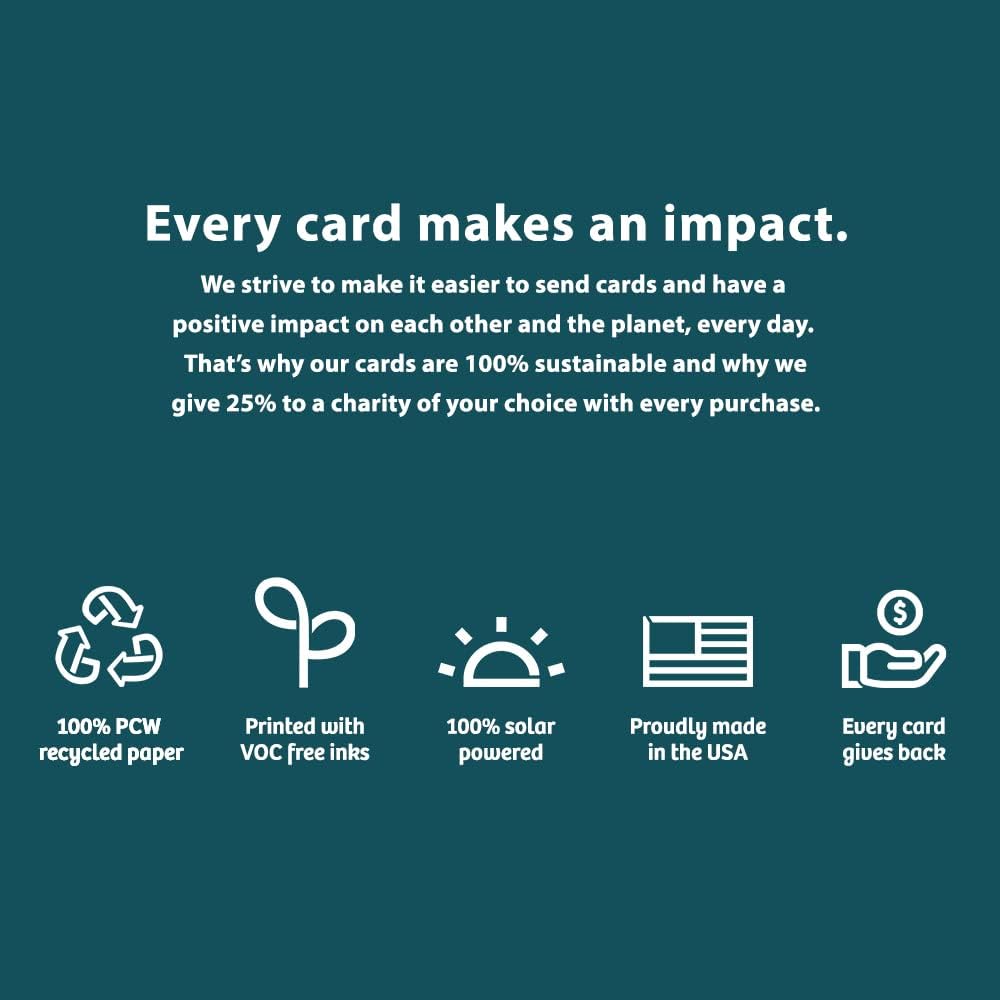 Tree-Free Greetings strives to use the most sustainable materials and processes possible. Printed and assembled in the USA on 100 percent post-consumer recycled paper, this set of 12 blank notecards is the perfect way to send your best wishes for any occasion. These notecards measure 4 x 6 inches and have matching color-coordinated envelopes. Add some flair to your handwritten notes with these unique, beautiful blank notecards that are green e-certified. Brighten someone’s day, and brighten everyone’s future with a sustainable Tree-Free gift today!