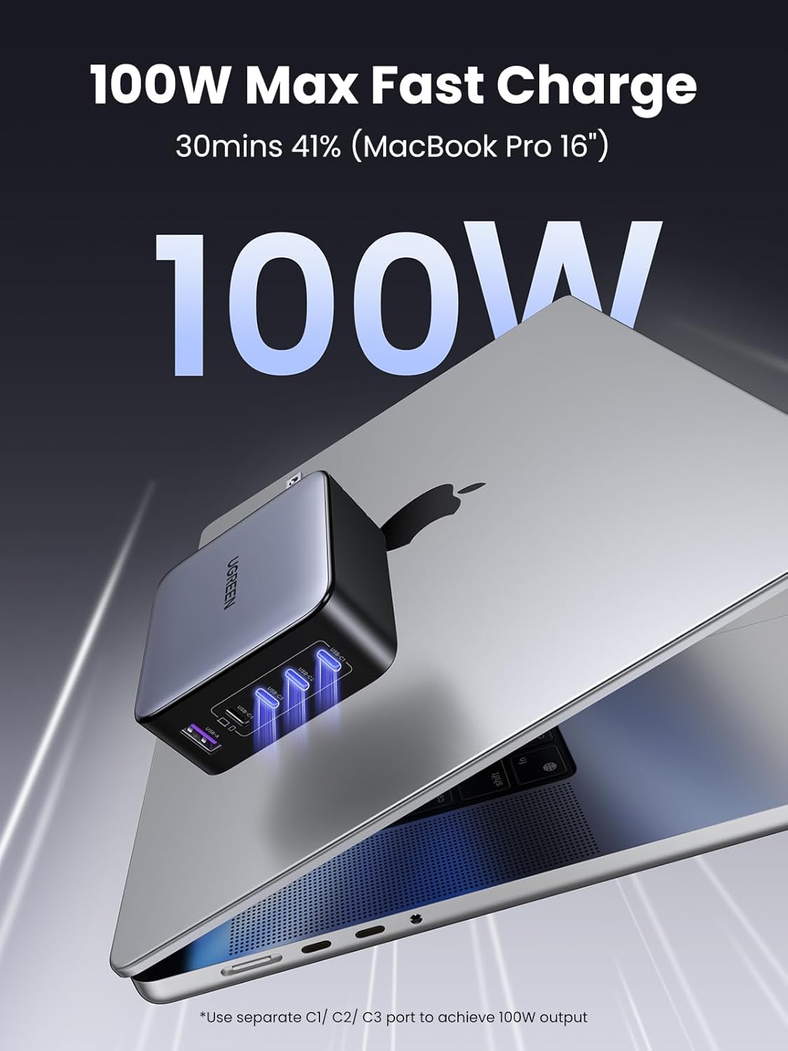 Ultra-Powerful 100W Charging: UGREEN Nexode 100W USB C charger block boasts a max output of 100W, with a single USB C port (USB C1/USB C2/USB C3 port) can support 100W charging, charging your MacBook Pro up to 41% in 30 minutes