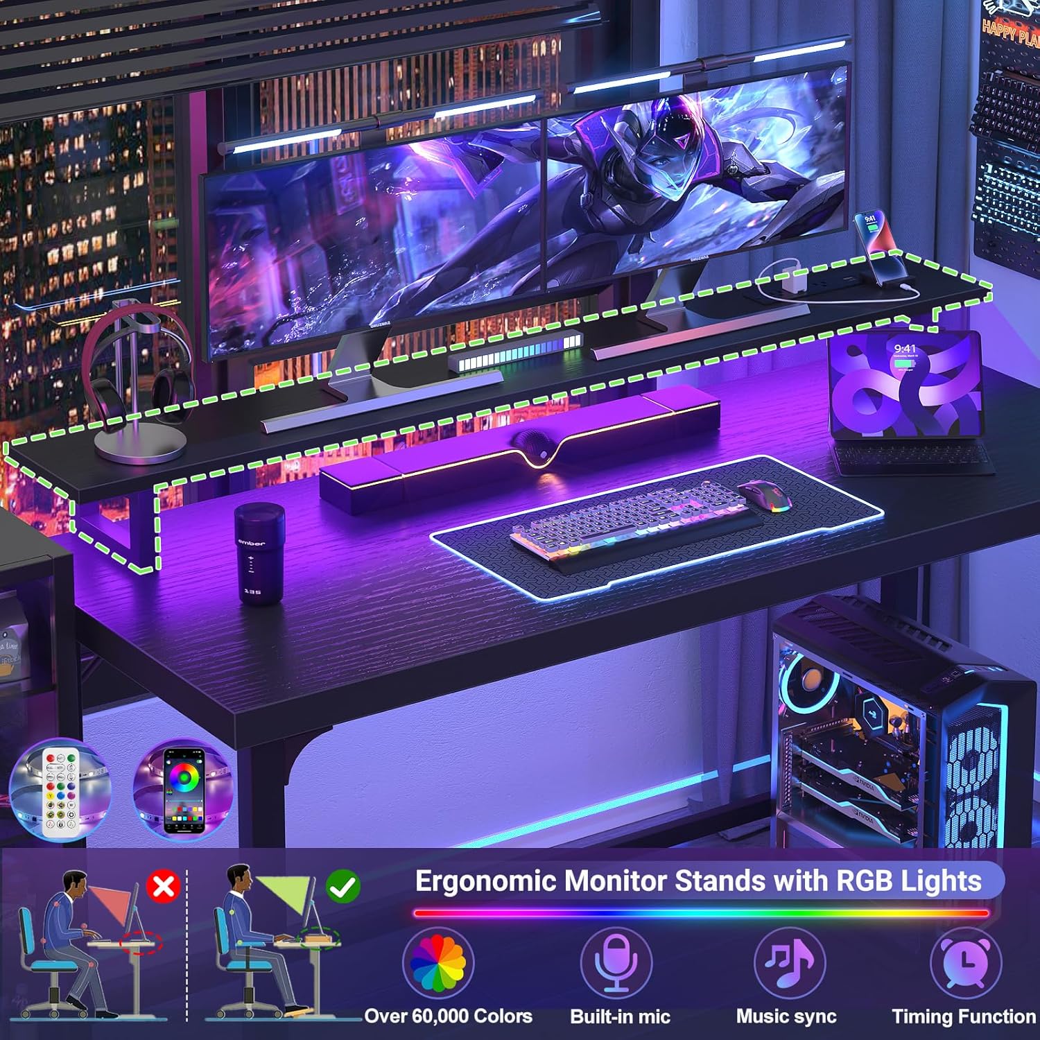 Gaming Computer Desk with LED Light: The home office desk has a smart RGB LED light strip, provides over 60,000 colors & 29 flashing modes. The light has a built-in mic, music sync, and timer functions that can create a perfect ambiance that enhances your room.