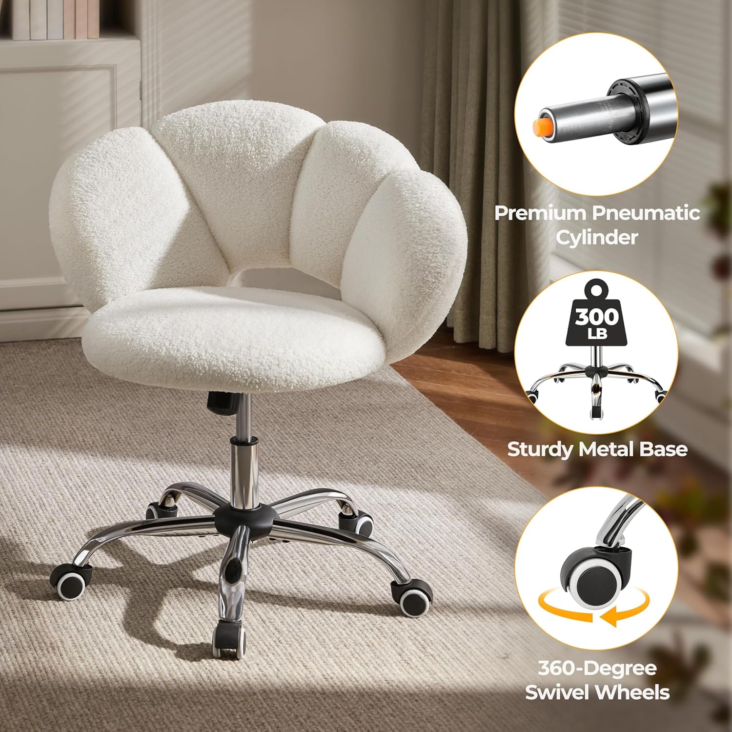 Cloud-inspired Backrest: Inspired by fluffy clouds, this swivel vanity chair features an adorable backrest made of four oversized, plump cushions covered in teddy boucle fabric for ultimate comfort. It will transform your living or office space into a serene oasis with a touch of personality