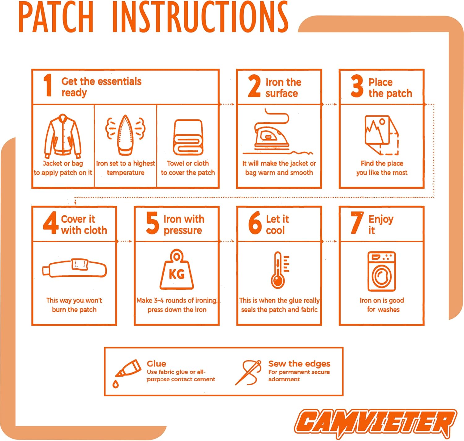 Simple to apply iron on or sew on: Applying our CAMVIETER iron on fabric patches for clothes, patch iron on, sew patches, embroidery patches for jeans are incredibly easy. Simply place the patch on your desired fabric, cover it with a thin cloth, and press with a hot iron for about 30s. The heat activates the adhesive, securely bonding the patch to your fabric. If you want extra durability or prefer a more permanent option, you can also sew the patch in place. No special tools are required, making these patches perfect for DIY enthusiasts and beginners alike. They offer a quick and hassle-free way to personalize your items in just a few minutes.